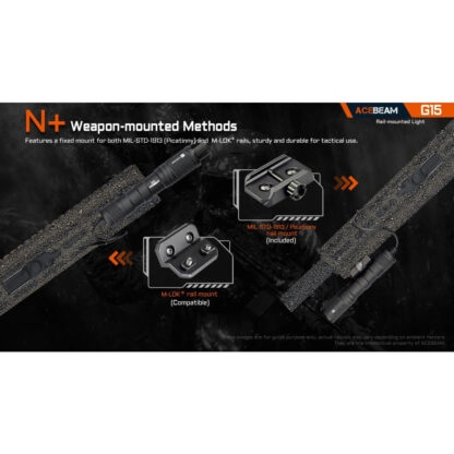 The AceBeam G15 rail mount light offers intuitive control with a tactical tail switch and a remote switch option, providing flexibility in various operational scenarios. Powered by 1x USB-C 18650 Li-ion battery(included), and compatible with 2 x CR123A, the AceBeam G15 rail-mount light utilises the original Luminus SFT-40 (6500K) LED to boost an astonishing 1800lm with up to 390 metres max throw, easily penetrating smoke, rainstorms, or dust. It features fixed mounts for MIL-STD-1913 (Picatinny) and M-LOK® rails, and is compact, at just over 122mm in length and head Φ of 25.4mm. The innovative phos-copper braze alloy springs protect against power failures caused by strong shocks during firing, ensuring reliable performance in high-stress situations.