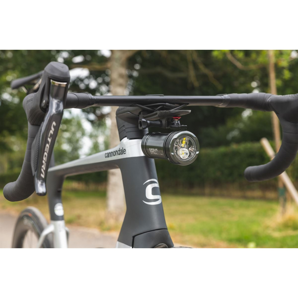 Taking its lead from car headlight technology, dual lenses deliver an optimum beam for road cycling with a flat beam for the periphery and a spot beam lighting the way ahead, which can by dipped for oncoming traffic with the included handlebar mounted, wired switch.