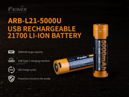 Fenix ARB-L21-500U provides sufficient power, and steady performance, and the capacity of the 21700 battery is twice as powerful as the common 18650/2300mAh battery. It provides compatible lighting tools with sufficient power and longer duration. Multiple protection, ensures safety and good performance of the battery; Steel shell riveting technology, fully protects the battery against damage; Pressure relief vents, rapidly expel internal gas.