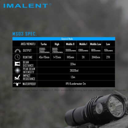 Middle II output : 3000 Lumens;Run-time : 1h15min