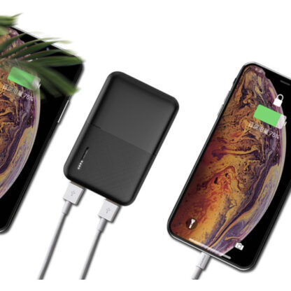 Mini pocket sized 5000mAh portable power bank, with power level display. Convenient for when a quick battery top-up is required for small devices like phones and tablets. 1x USB-A output, and 1x USB-C output. with power level indicator.