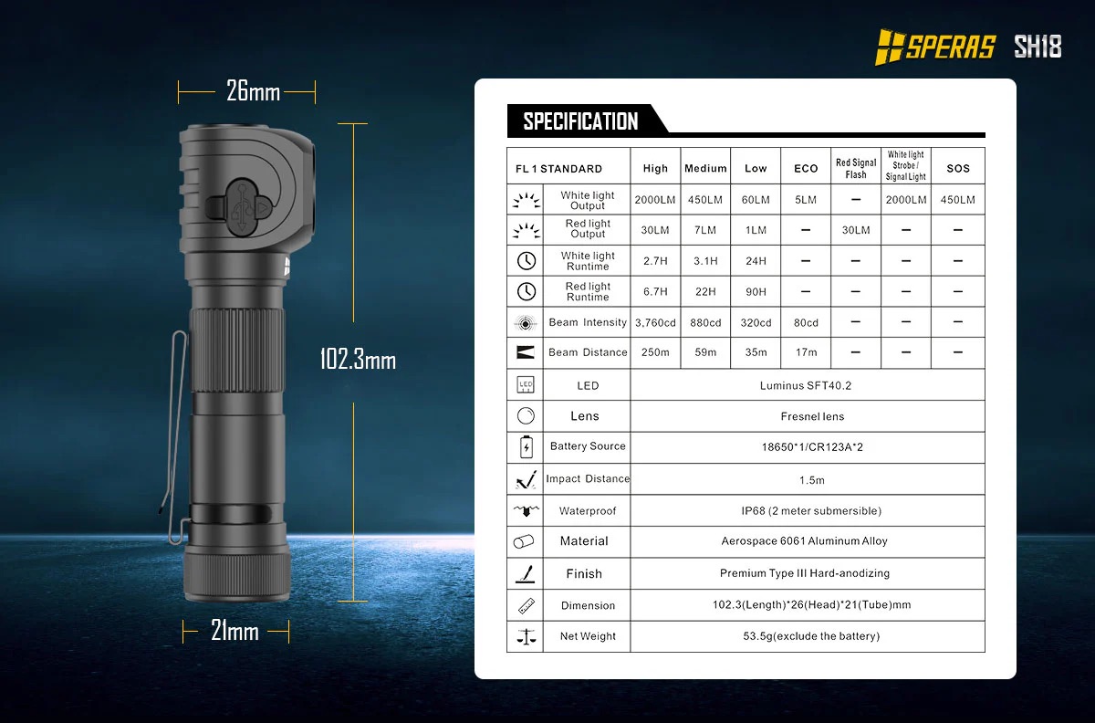 The Speras SH18 is a highly adaptable lighting tool designed for users who need powerful illumination with flexible hands-free options. Delivering an impressive 2000 lumens and a beam distance of up to 250 metres, this right-angle light provides excellent reach and clarity for outdoor activities, work environments, or emergency situations. Its modular design allows the light to function as both a headlamp and a standalone handheld torch — simply attach or detach it from the quick-release bracket. With multiple white-light levels, red-light modes, a magnetic tail-cap, and comfortable wearability, the SH18 offers reliable performance whether you’re navigating trails, working in tight spaces, or handling night-time tasks.