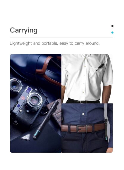 【Easy to Operate and Carry】This LED pocket pen light utilises a solid plastic tail switch, easier to push than common silica gel switch. With curved line body and lozenge pattern, it allows you to operate with one hand, free your other hand to work. With the weight of 1.7oz, 48g (battery included) and the removable pocket clip, the mini torch is very portable and convenient to carry on your pocket, tactical bags, etc.